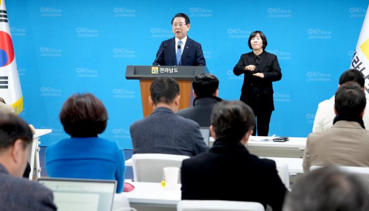 ![]() 김영록 지사 전남·광주 3+1축 산업 대부흥 비전 발표 사진-김영록 전라남도지사가 12일 도청 브리핑룸에서 400만 전남광주통합특별시 실현을 위한 전남·광주 3+1축 산업 대부흥 비전을 발표하고 있다. |