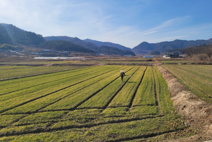 ![]() 보성군, 맥류 생육 재생기 시작! 요소 웃거름 시비 당부_맥류 웃거름을 살포하고 있다 |