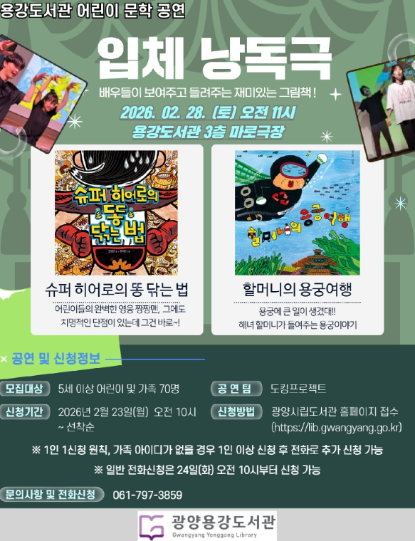 이번 공연은 대학로 연극배우들이 주축이 되어 문학과 공연예술 접목해 입체낭독극을 기획·제작·공연하는 ‘도킹프로젝트’가 진행하며, ▲입체낭독극 소개 ▲'할머니의 용궁 여행' 낭독극 ▲'슈퍼 히어로의 똥 닦는 법' 낭독극 ▲기념촬영 순으로 운영된다. 관람은 광양시 어린이와 가족 70명을 대상으로 진행될 예정이다.