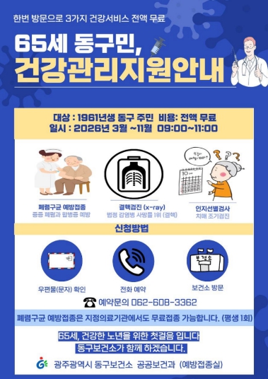 동구 관계자는 “65세는 법적으로 노인 연령이 시작되는 시점이지만, 동시에 앞으로의 건강을 체계적으로 관리하기 시작하는 중요한 출발점”이라며 “이번 통합 건강점검을 통해 주민들이 자신의 건강 상태를 정확히 점검하고, 예방 중심의 건강관리로 자연스럽게 이어지도록 적극 지원하겠다”고 말했다.