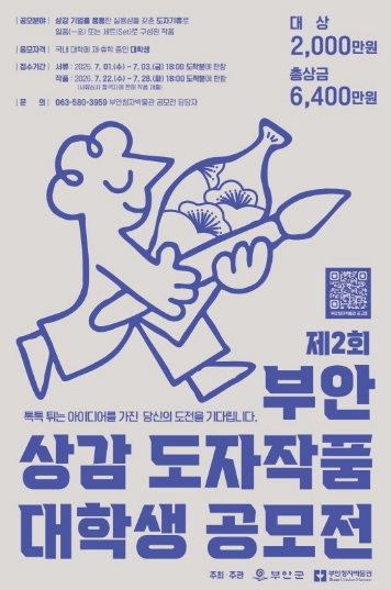 이번 공모전은 부안군과 부안청자박물관이 공동으로 주최·주관하며 국내 대학에 재학 또는 휴학 중인 대학생이라면 누구나 참여할 수 있다.