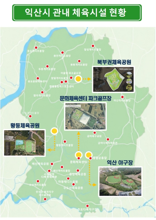기존 파크골프장을 18홀에서 36홀로 늘리고 족구장과 녹지 공간을 더해 시민 쉼터로 탈바꿈시킨다. 황등면에도 축구장과 산책로를 갖춘 복합 체육공간이 들어설 예정이다.