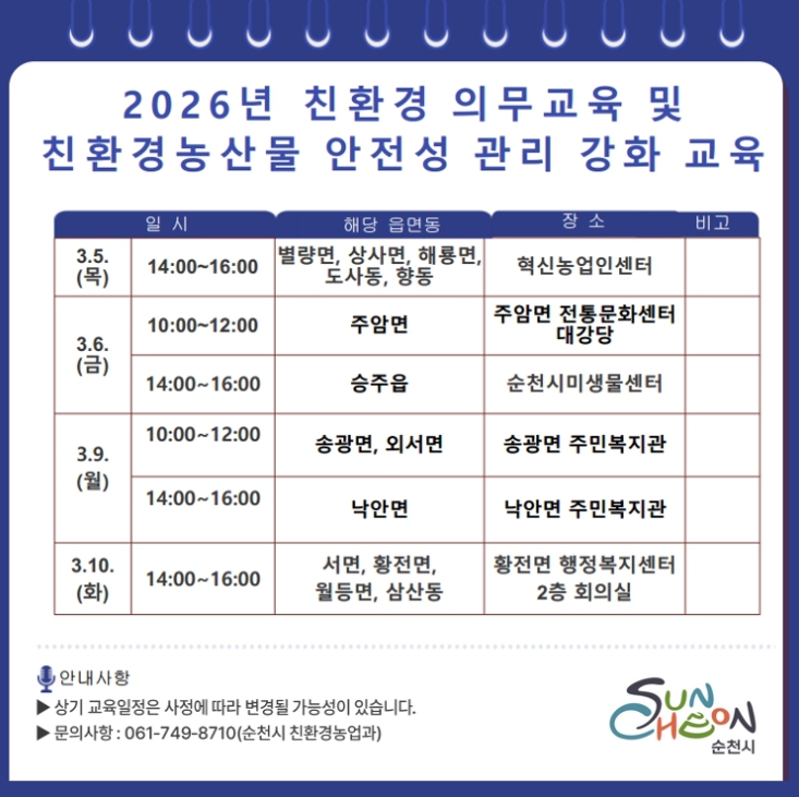 시 관계자는 “이번 의무교육은 친환경 인증과 연계된 제도 변화에 대응하기 위한 자리”라며 “앞으로도 친환경농업 확대와 안전한 농산물 생산 기반 조성에 지속적으로 노력하겠다”고 밝혔다.