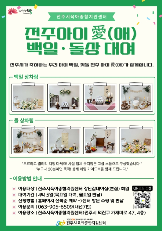 시는 양육 가정의 경제적 부담을 줄이고, 출산 친화적 환경을 조성하기 위해 전주시육아종합지원센터를 통해 ‘전주 아이愛(애) 백일·돌상 대여 사업’을 본격 추진한다고 4일 밝혔다.