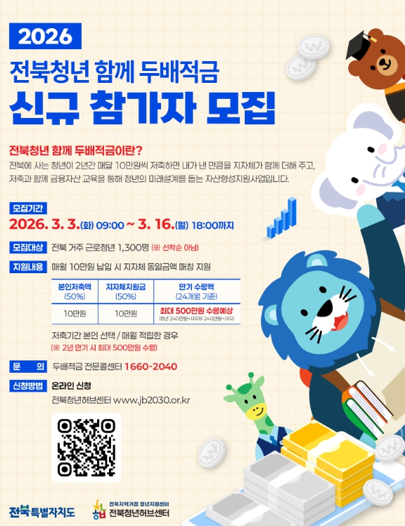 신청은 오는 16일 오후 6시까지 전북청년 함께 두배적금 누리집(double.jb2030.or.kr)에서 온라인으로 접수하며, 200여 명을 선정해 지원할 예정이다.