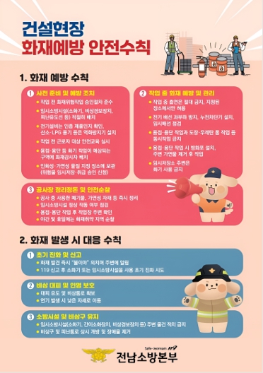 ▲작업 전 화기취급 작업 승인 절차 준수 ▲임시소방시설 적정 배치▲작업장 주변 가연물 및 인화성 물질 제거▲용접․용단 작업 시 화재 감시자 배치 등 화재안전수칙 준수를 중점적으로 지도할 예정이다. 또한 작업 종료 후 잔여 불씨로 인한 화재를 방지하기 위한 사후 점검과 공사장 내 폐기물 및 가연성 자재 정리 등 기본적인 안전관리 사항도 함께 안내할 계획이다.