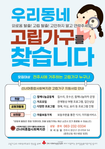 선너머종합사회복지관은 고립가구 지원사업 참여자를 상시 모집하고 있으며, 앞으로도 도움이 필요한 고립 위험 가구를 지속적으로 발굴해 지역사회 기반 돌봄 체계를 강화할 계획이다.