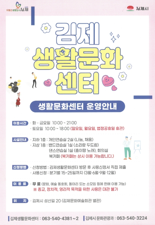 ![]() 김제시, 생활문화센터 2분기 이용자 모집 |