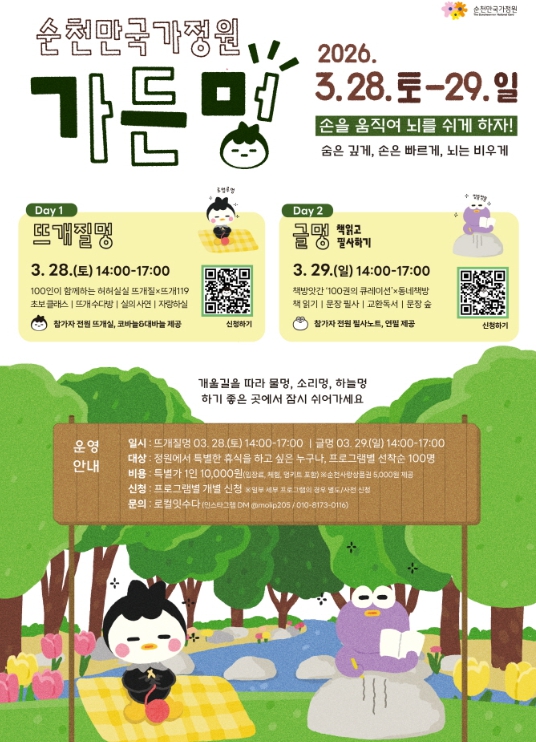 시 관계자는 “봄을 맞은 순천만국가정원에서는 이번 ‘가든멍’ 행사뿐만 아니라 4월 초 스페이스허브에서 ‘정원 봄꽃 피크닉’, 네덜란드 정원 일원에서 ‘국가정원 튤립 페스티벌’ 등 다양한 봄 프로그램이 이어질 예정이다”며 “올봄 정원에서 여유로운 봄소풍을 즐기시기 바란다”고 말했다.
