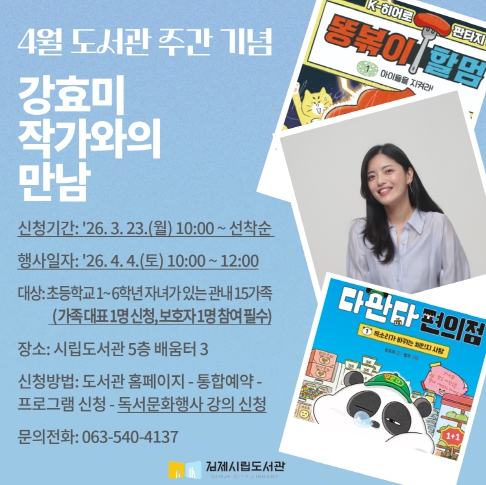 ![]() 김제시립도서관, 4월 도서관 주간 행사 강효미 작가와의 만남 진행 |
