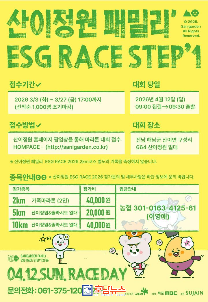 해남 산이면에 위치한 산이정원은 오는 4월 12일 ‘산이정원 ESG 페스티벌’의 핵심 프로그램으로 「산이정원 ESG RACE STEP 마라톤 대회」를 개최한다고 밝혔다.