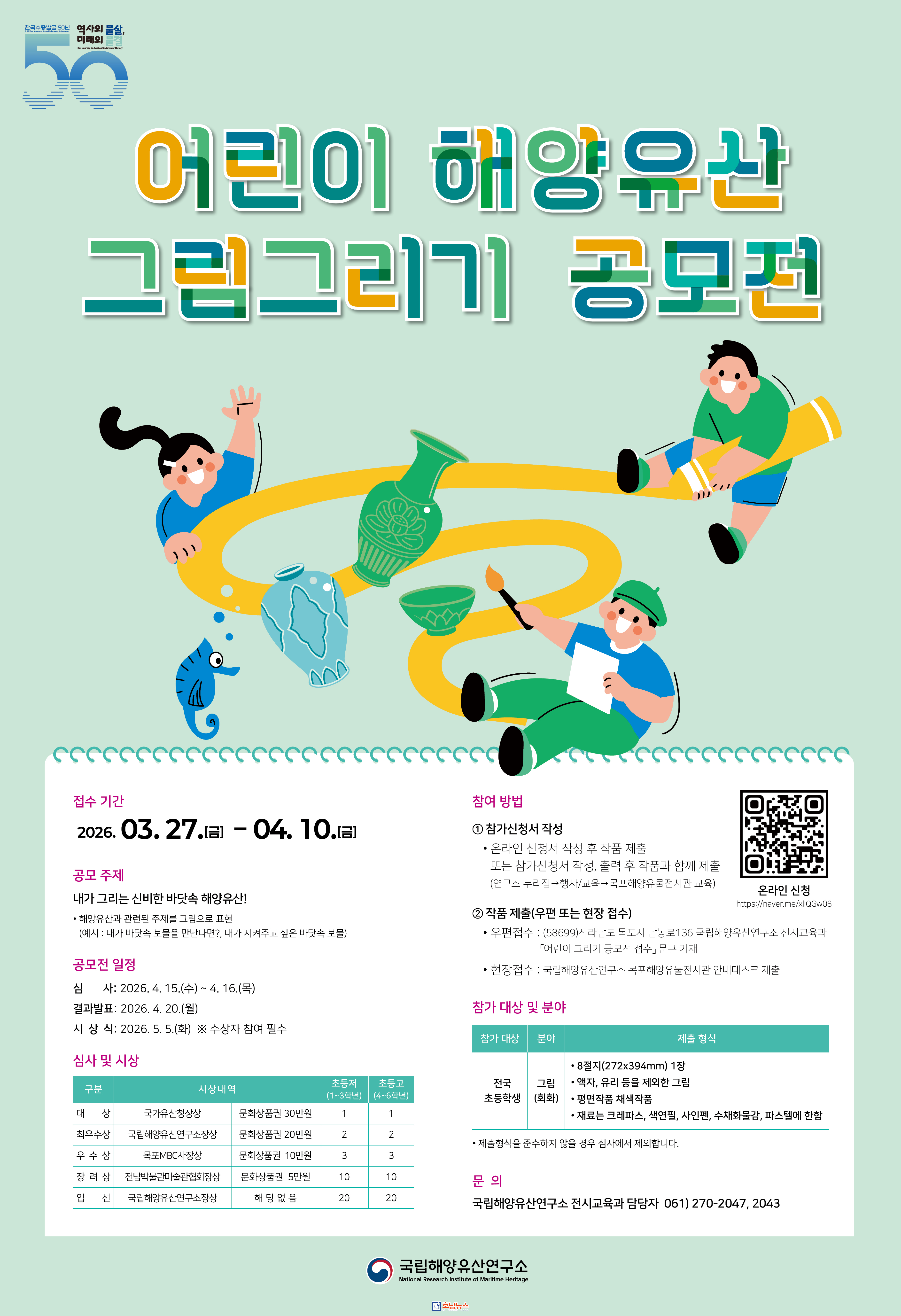 ![]() ‘한국수중발굴 50주년 기념 어린이 그림 공모전’ 포스터 / 사진제공=국가유산청 국립해양유산연구소 |