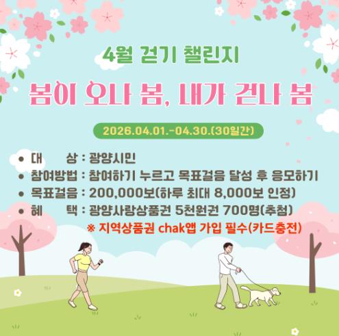 ![]() 광양시, 워크온 ‘봄이 오나 봄, 내가 걷나 봄! 4월 걷기 챌린지’ 운영 |