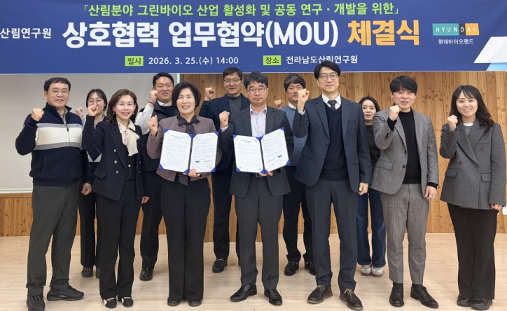 전남도산림연구원은 산림청의 ‘2026년 산림분야 그린바이오 미래형 가치사슬 기술개발(R&D)’ 공모사업에서 4개 과제가 선정돼 총 104억 원의 국비를 확보했으며, 이 중 1개 과제에는 ㈜현대바이오랜드가 공동 연구기관으로 참여하고 있다. 두 기관은 이 과제를 통해 향후 5년간 디지털 기반 원물 양산화와 기능성 검증, 표준화 연구를 함께 수행하며 전남 산림바이오산업의 경쟁력 강화에 힘을 모을 계획이다.