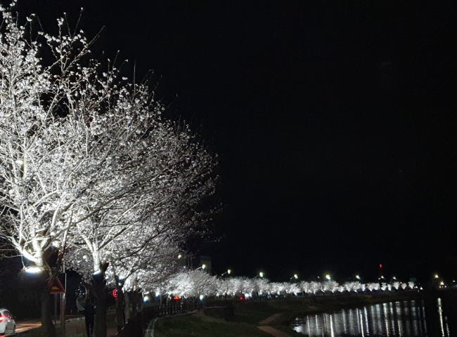 군은 단순한 조명 설치를 넘어 하천 주변 자연환경과 조화를 이루는 경관 연출에 중점을 두고 사업을 진행했다. 산책로 일대에는 연분홍과 화이트 계열 조명을 활용해 벚나무 경관을 정비했으며, 이를 통해 야간에도 밝고 안정적인 보행 여건을 마련했다.