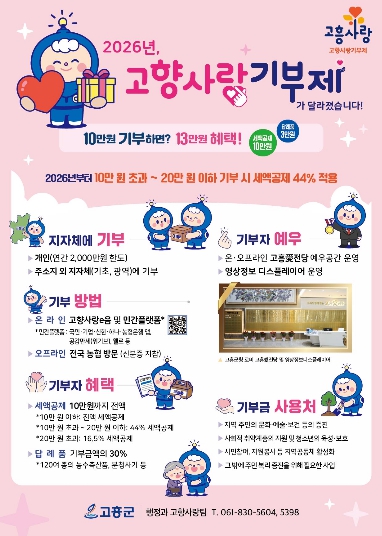 한편, 고향사랑기부제는 개인이 주소지를 제외한 다른 지방자치단체에 기부할 수 있는 제도로, 기부금에 대한 세액공제와 함께 지역 특산품 등 답례품을 제공받을 수 있다.