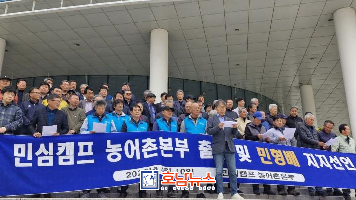 농어촌기본소득운동전남연합, 농민운동역사관건립추진위원회, 광주전남농민운동동지회 등 3개 단체는 10일 전남도청 앞에서 기자회견을 열고 ‘농어촌기본소득 실현’을 전제로 한 정책연대와 함께 민형배 후보 지지를 공식화했다.