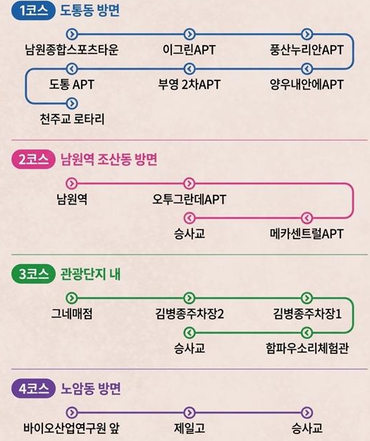 무료 셔틀버스는 총 4개 노선으로 운영되며, 구체적인 구간은 ▲1노선 남원종합스포츠타운 ↔ 천주교 로타리 ▲2노선 남원역 ↔ 승사교 ▲3노선 그네매점 ↔ 승사교 ▲4노선 남원바이오산업연구원 ↔ 승사교 등이다.