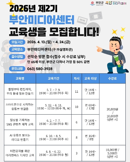 ![]() 부안미디어센터, 2026년 제2기 미디어 교육 교육생 모집 |