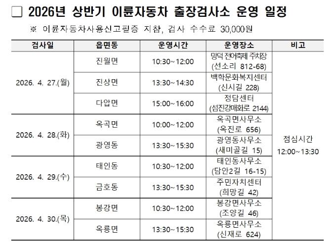 ![]() 광양시 2026년 상반기 이륜자동차 출장검사소 운영 교통과(운영일정 및 장소) |