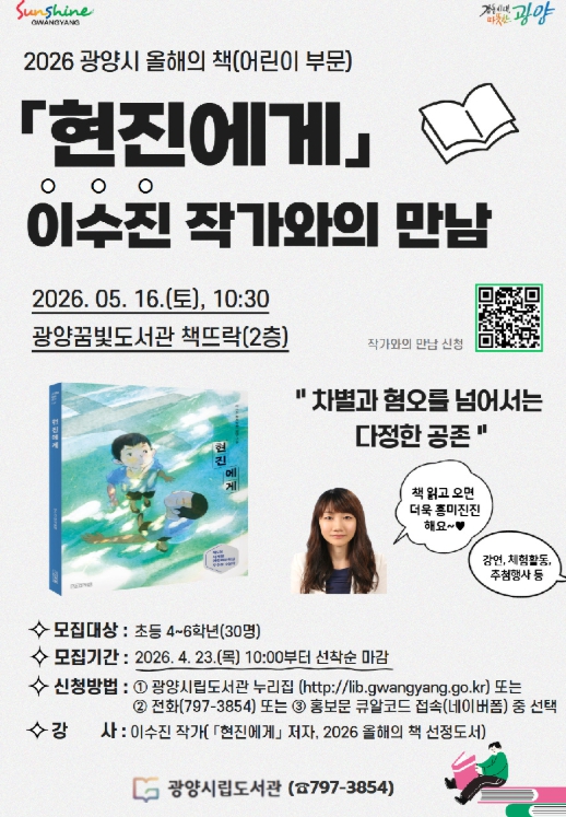 [AI 호남뉴스] 광양시는 오는 5월 16일 오전 10시 30분 꿈빛도서관에서 ‘2026년 올해의 책’ 어린이 부문 선정 도서'현진에게'의 저자 이수진 작가를 초청해 강연을 연다고 밝혔다.