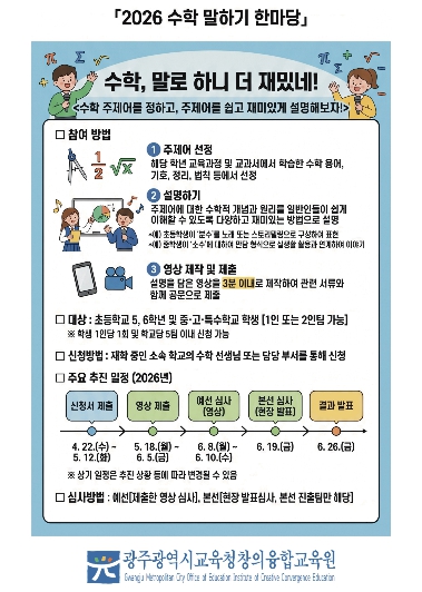 ![]() [포스터] 광주창의융합교육원, ‘2026 수학 말하기 한마당’ 개최 |