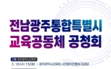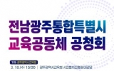 [AI 호남뉴스]광주시교육청 ‘광주전남교육행정통합실무단’과 전남도교육청 ‘전남광주교육행정통합추진단’이 교육통합과 관련해 시도민의 이해를 돕기 위해 ‘전남광주통합특별시 교육공동체 공청회’를 개최한다. 이번 공청회는 광주 실무준비단과 전남 통합추진단이 지난 9일 실무 협의회를 통해 광주전남 통합교육체계 구축을 위한 교육공동체 의견수렴의 필요성에 대해 공감대를 형성하면서 마련했다. 공청회는 18일 오후 3시 광주시민협치진흥원 대강당과 23일 오후 3시 전남 순천만생태문화교육원 등에서 두 차례에 걸쳐 진행된다. 주요 내용은 ▲교육행정...