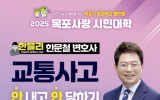 목포 박인석 기자2025. 11.06[뉴스채널]목포시는 오는 11월 11일 오후 2시 목포시민문화체육센터에서 한문철 변호사를 초청해 ‘교통사고 안 내고 안 당하기’를 주제로 특강을 연다. 이번 강연은 목포시와 국립목포대학교가 공동 운영하는 '목포사랑 시민대학' 강좌의 일환으로 마련됐다. JTBC ‘한블리(한문철의 블랙박스 리뷰)’로 잘 알려진 한문철 변호사는 교통사고 처리 분야의 대표적인 전문가로, 실제 사고 영상과 판례를 통해 법적 책임 비율, 사고 대처 요령 등 일상에서 도움이 되는 교통법률 정보를 알기 쉽게 전할 예정이다. '목포사랑 시민대학'은 ‘글로컬...