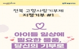 전라북도 메인 박인석 기자2025. 10.17[뉴스채널]전북특별자치도가 도민이 체감할 수 있는 첫 지정기부사업을 발굴하고 20일부터 본격적인 모금에 나선다. 지정기부사업은 기부자가 고향사랑기부금을 자신이 원하는 사업을 직접 지정해 기부할 수 있는 제도로, 주민이 필요로 하는 사업에 직접 기여하고 그 성과를 눈으로 확인할 수 있다는 점에서 참여형 기부문화 확산의 새로운 계기가 될 전망이다. 이번에 추진되는 첫 지정기부사업은 ▲‘가정위탁 아동용품 구입비 지원사업’ ▲‘장애인 교통약자 이동편의 증진지원사업’ 이다. ‘가정위탁 아동용품 구입비 지원사업’은 부모의 보호를 받지 못...