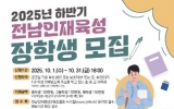 전라남도 박인석 기자2025. 10.13[뉴스채널]전라남도와 전남인재평생교육진흥원은 실질적인 교육기회 보장과 미래인재로의 성장, 지역 정착을 지원하기 위한 2025년 하반기 전남인재육성 장학생을 오는 31일까지 모집한다. 신청 대상은 공고일 기준 학생 본인 또는 보호자(부 또는 모, 후견인)가 1년 이상 계속해서 전남도에 주민등록이 돼있는 초·중·고등학생과 대학생, 공고일 기준 전남도에 1년 이상 체류 중이며 남은 체류 기간이 6개월 이상인 외국인 유학생이다. 선발분야는 ▲전남인재 장학금 ▲전남정착 장학금 ▲특별지정 장학금 총 3개의 분야 15종이며, 장학생 868명...