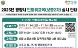 광양 박인석 기자2025. 10.21[뉴스채널]광양시는 10월부터 상반기 기본교육을 이수하지 않은 민방위 대원을 대상으로 ‘2025년 민방위 보충 2차 교육’을 실시한다고 밝혔다. 이번 보충 교육은 민방위 대원의 임무와 역할, 장비 운용, 응급처치, 재난대비, 화생방 대응 등 유사시 실전 대응 역량 강화를 위한 학습으로 구성됐으며, 민방위 대원의 복무 연차별로 구분해 진행된다. ▲ 1~2년 차 대원은 4시간 집합교육, ▲ 3~4년 차 대원은 2시간 사이버교육, ▲ 5년 차 이상 대원은 1시간 사이버교육을 각각 이수해야 한다. 사이버교육(3년차 이상)은 10월 ...