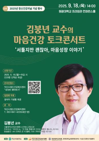 익산시는 정신건강의 날(10월 10일)을 기념해 오는 9월 18일 오후 2시, 원광대학교 프라임관에서 '마음건강 토크콘서트'를 개최한다고 21일 밝혔다.