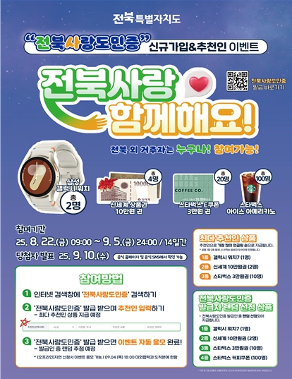 도는 8월 22일부터 9월 5일까지 14일간 ‘전북사랑, 함께해요!’라는 이름으로 이벤트를 진행한다. 기간 중 신규 가입자가 추천인을 기재하면 자동으로 응모되며, 당첨자는 무작위 추첨과 최다 추천자 순으로 선정된다.
