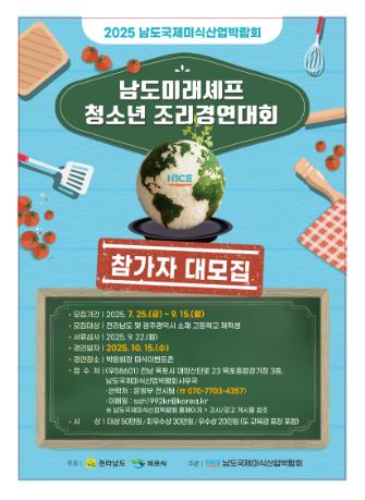 홍양현 남도국제미식산업박람회 사무국장은 “남도의 식재료로 청소년이 펼치는 이번 조리 경연은 단순한 대회를 넘어, 남도 미식에 대한 이해를 넓히고 꿈을 실현하는 특별한 경험이자 성장의 발판이 될 것”이라며 “미래 셰프들의 적극적인 도전과 참여를 기대한다”고 말했다.