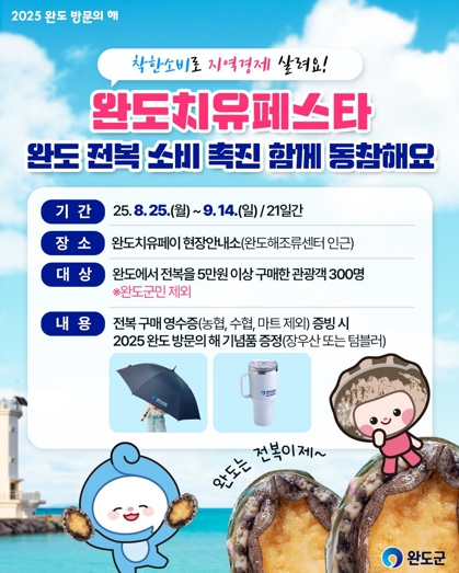 한편 군은 ‘2025 완도 방문의 해’를 계기로 다양한 관광·소비 촉진 정책을 추진해 관광 및 경제 활성화에 힘쓴다는 방침이다.