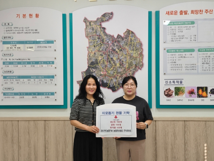 나용성 주산면장은 “매년 기부 문화 확산에 참여해 주시는 엄수현 대표님께 감사드린다. 앞으로도 지역 농산물을 활용한 다양한 생산업체가 유입되어 지역사회가 활성화 되길 바란다.”고 말했다.