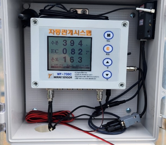 시설 토경 관개 자동제어 시스템은 하우스 내 토양 수분 상태를 실시간으로 모니터링해 관수를 자동으로 제어하는 시스템으로 토양수분을 측정하는 센서부, 자동 펌프 및 밸브 등을 제어하는 제어부, 실시간 토양수분 변화를 볼 수 있는 모니터링부로 구성되어 있다.