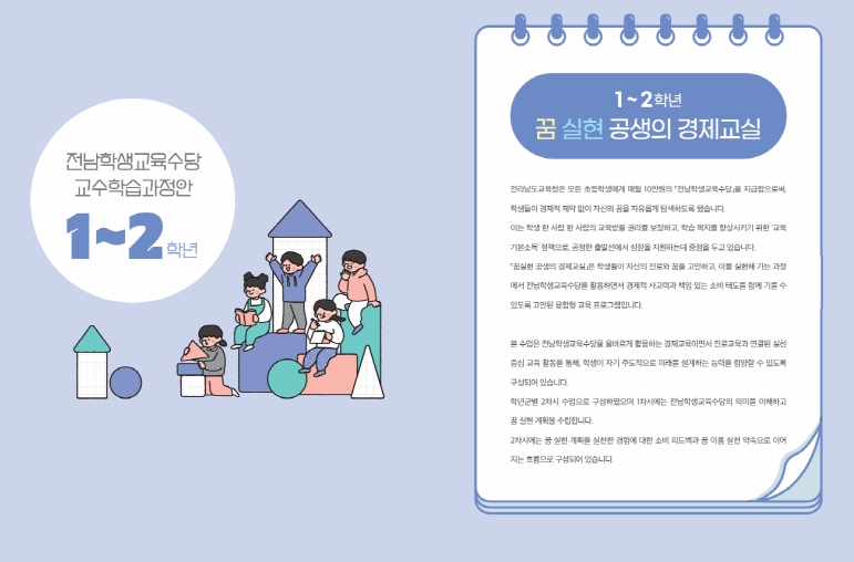 ‘꿈실현 경제교실 교수학습과정안 e-book’은 초등학교 1~2학년, 3~4학년, 5~6학년 등 학년군 별 맞춤형 2차시 수업으로 구성됐다. 첫 수업에서는 학생들이 전남학생교육수당의 의미를 이해하고 자신만의 꿈 실현 계획을 세우도록 한다. 두 번째 수업에서는 실제 수당 사용 경험을 돌아보며 소비 습관을 성찰하고 ‘꿈을 키우는 수당 사용 약속’을 만들어 실천해 보도록 한다.