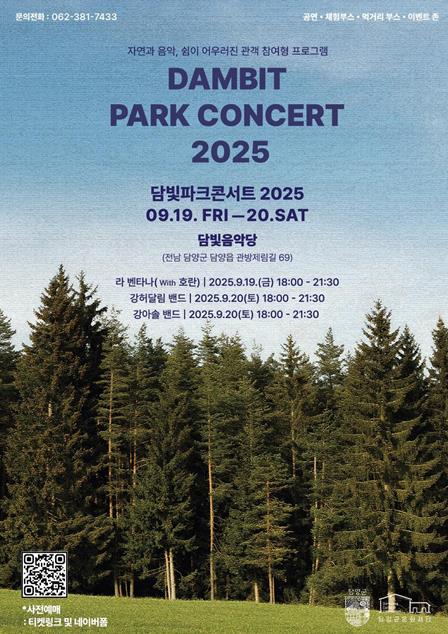 재단 관계자는 “라벤타나와 호란의 무대, 강허달림과 강아솔의 깊은 감성까지, 이틀 동안 전혀 다른 매력의 무대를 준비했다.”며 “군민과 관광객 모두 담양의 가을밤을 특별한 음악으로 만끽할 수 있을 것”이라고 전했다.