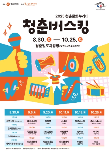 ‘청춘버스킹’은 광주공원 일대를 청춘의 열정과 낭만이 살아 숨 쉬는 문화광장으로 조성하기 위한 ‘청춘문화누리터’ 사업의 일환이다. 올해 상반기에도 총 6회의 공연을 통해 재즈‧밴드‧어쿠스틱‧포크 등 다양한 장르의 버스킹 무대를 선보이며 시민들의 큰 호응을 얻은 바 있다.