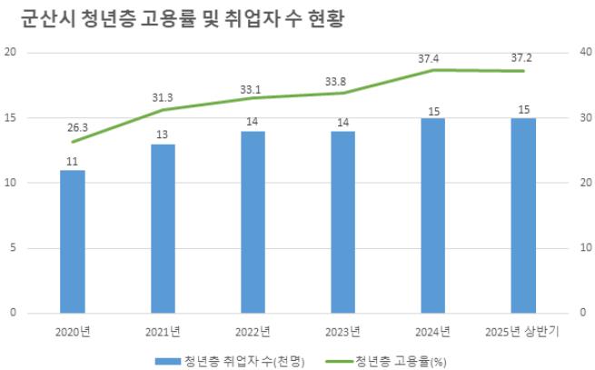 ![]() 군산시청년층고용률꾸준한상승세유지(군산시청년층고용률및취업자수현황그래프) |
