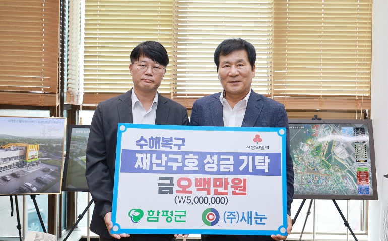 함평군은 28일 “㈜새눈(대표 백청열)이 지난 27일 재난구호성금 500만 원을 군에 전달했다”고 밝혔다.