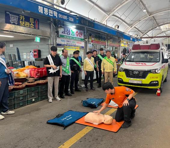 훈련에서는 화재 발생 시 초기진화를 위한 소화기와 옥내소화전 작동 방법, 심폐소생술 교육도 함께 진행돼 행사 참석자와 상인들로부터 큰 호응을 얻었다.