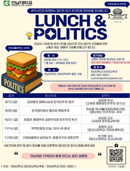 29일 전남대에 따르면 정치학 토크 콘서트 ‘런치·폴리틱스(Lunch·Politics)’ 시리즈가 2025년 가을학기(9월~11월) 동안 총 5회에 걸쳐 열린다.