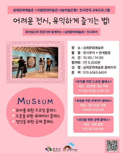 미술관이 어렵게 느껴지는 관람객들을 위해 ▲눈높이에 맞춘 작품 설명 스토리텔링 ▲깊이 있는 연계 활동지 ▲흥미를 북돋는 체험 활동 등 연령대별 맞춤형 프로그램으로 구성됐다.