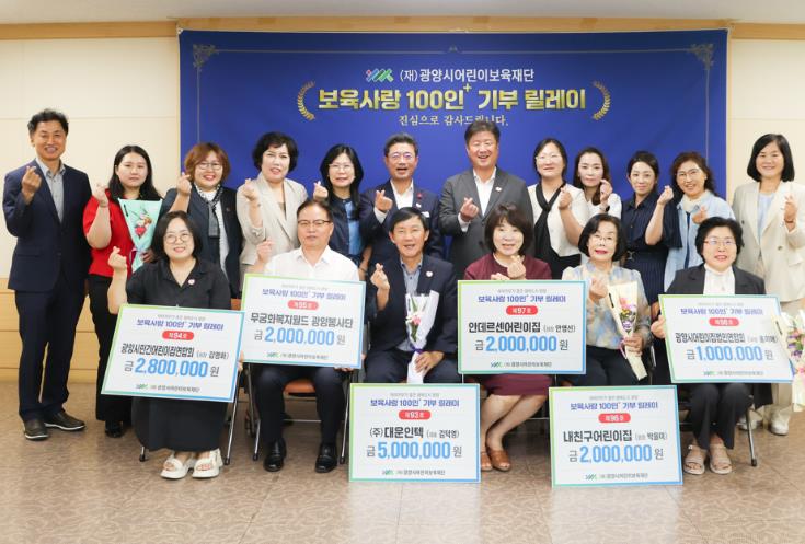 기부자 및 기부 금액은 △㈜대운인텍 500만 원 △광양시민간어린이집연합회 280만 원 △무궁화복지월드 광양봉사단 200만 원 △내친구어린이집 200만 원 △안데르센어린이집 200만 원 △광양시어린이집법인연합회 100만 원이다.