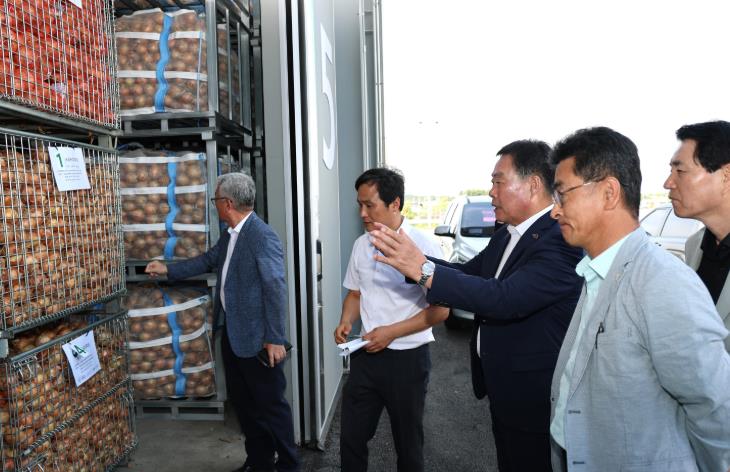 ![]() 28일 산지유통 실증센터 현장 점검에 나선 김산 군수 |