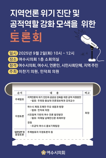 ![]() 여수시의회, 오는 9월 2일 ‘지역언론 위기진단과 공적역할 강화 토론회’ 개최 |