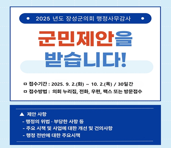 ![]() 2025년도 행정사무감사 군민제안 접수 |
