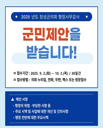 ![]() 장성군의회, 2025년도 행정사무감사 군민제안 접수 |